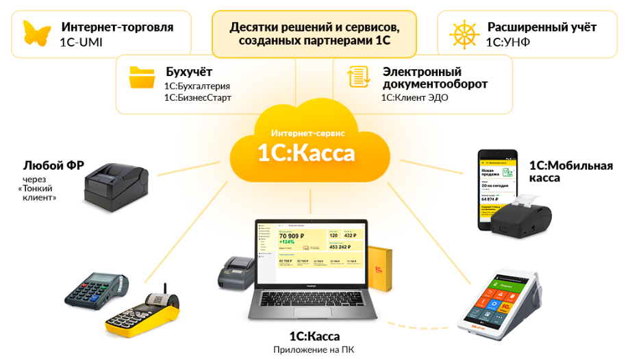 Сердце системы 1С-Просто – обновлённый интернет-сервис 1С:Касса, в который стекаются данные из ваших бизнес-приложений и рабочих мест, где бы они не находились. Не важно, какие онлайн-кассы вы используете – Атол или Штрих, смарт-терминалы Эвотор или Азур – 1С:Касса подружится с ними. Из любой точки мира с помощью интернет-браузера вы сможете контролировать свои продажи, следить за статистикой, управлять ценами. 1С:Касса будет вести для вас учёт остатков товаров, получит заказы из вашего интернет-магазина, примет документы из системы электронного документооборота, отправит данные для бухгалтера в 1С:БизнесСтарт или в 1С:Бухгалтерию.